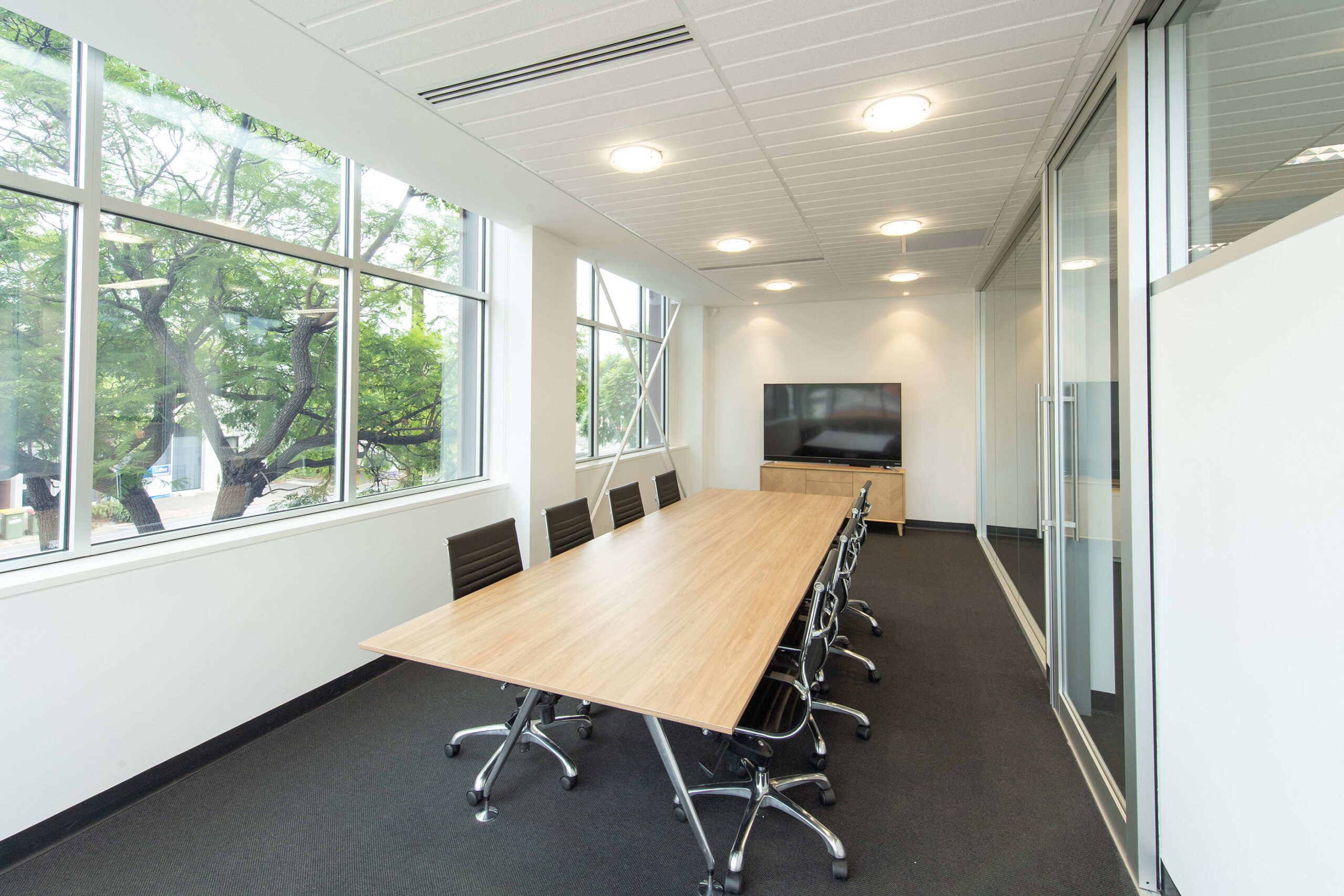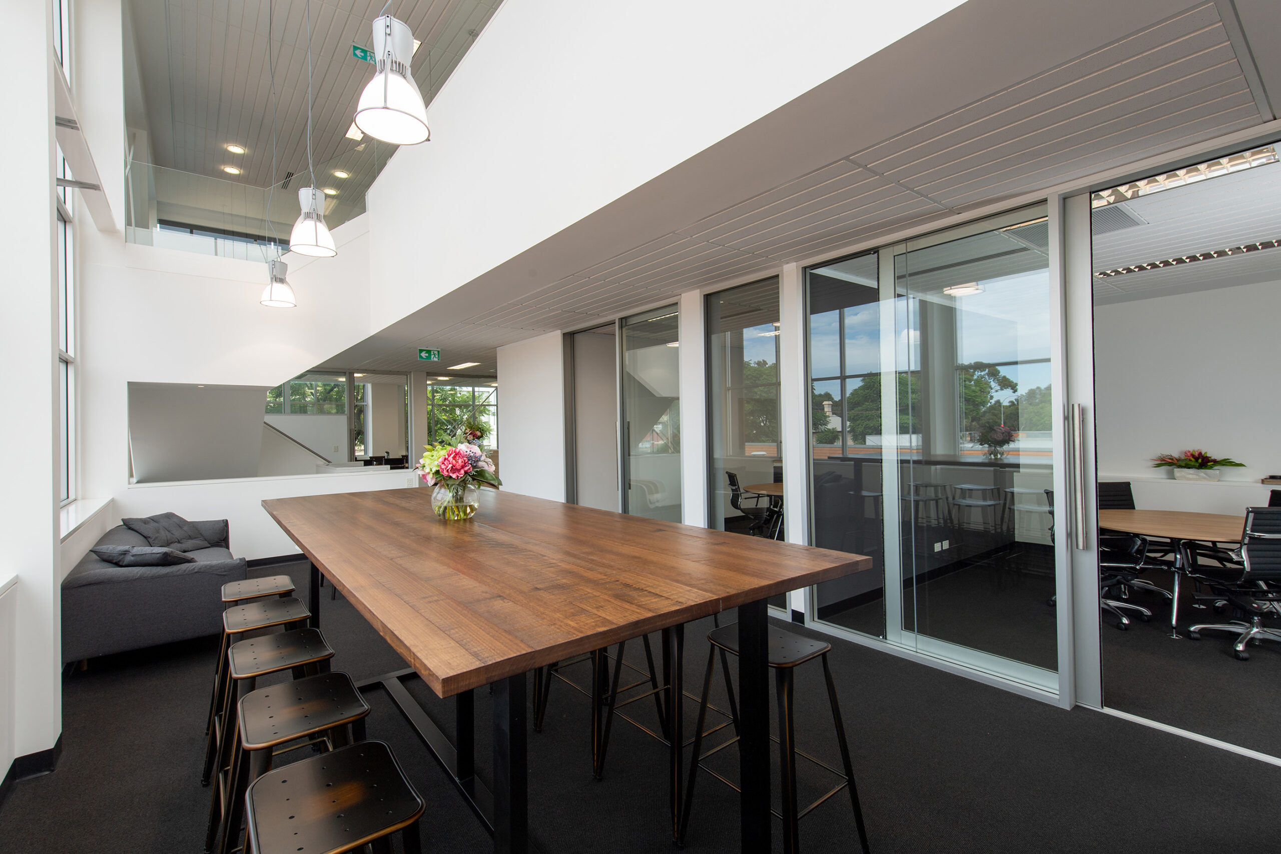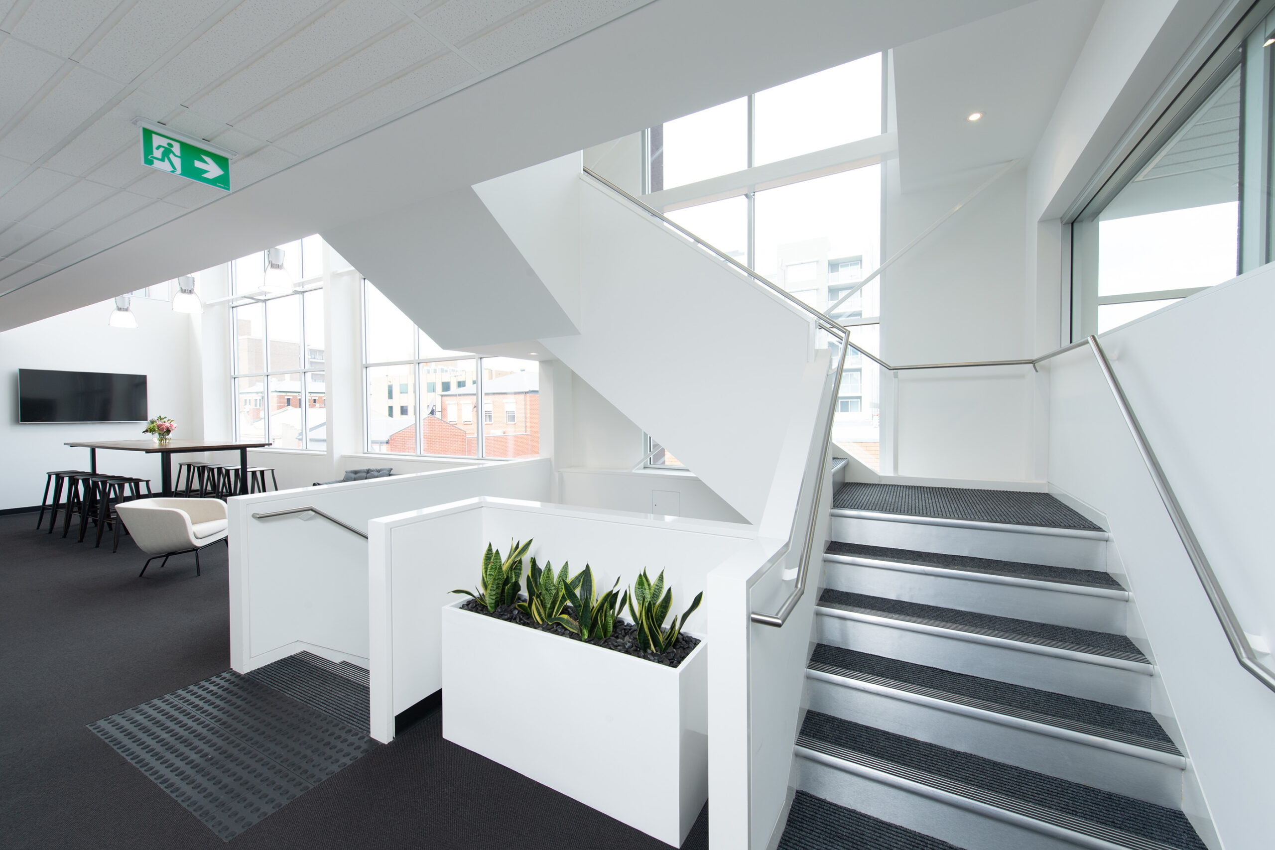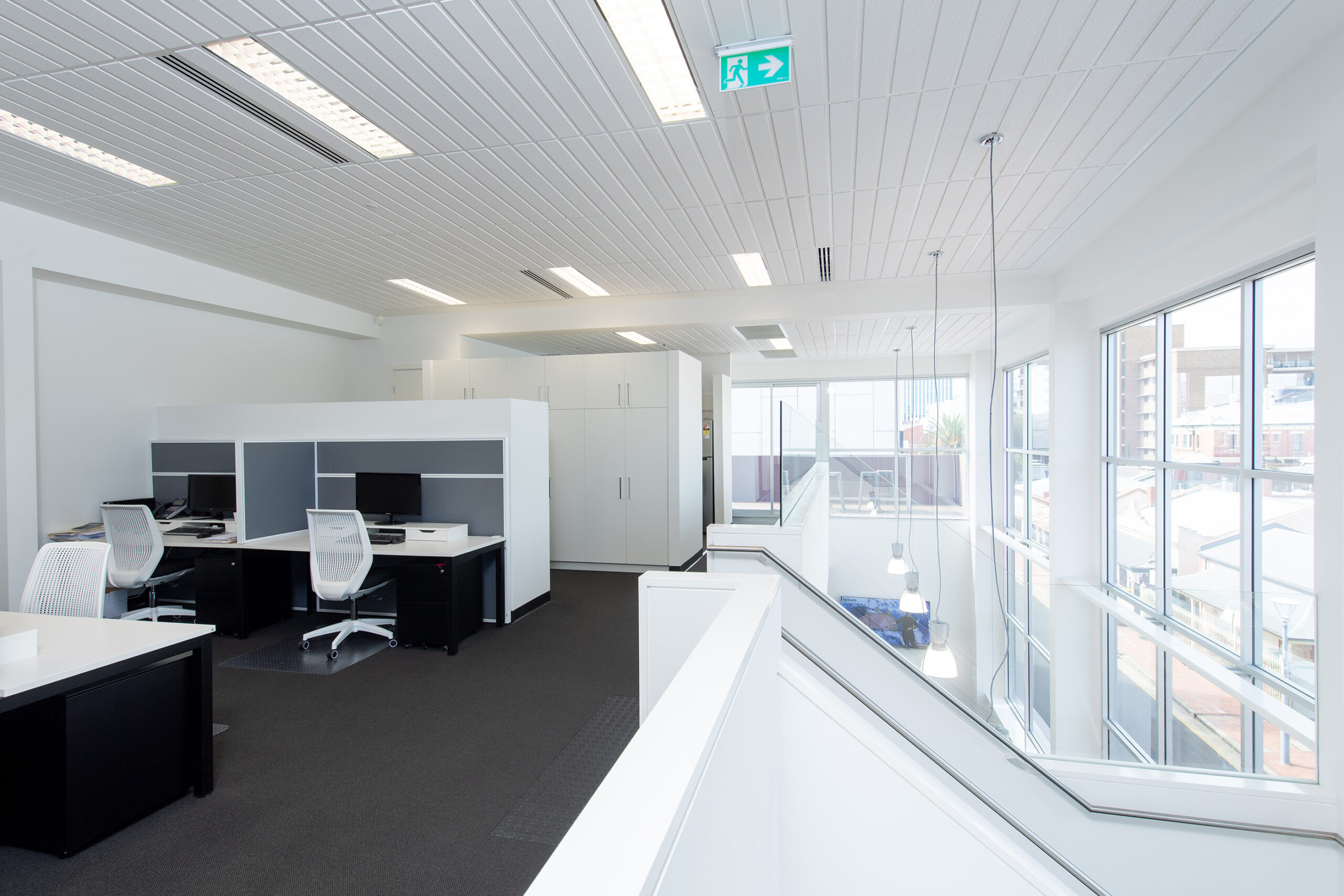 The fit-out required significant service alterations and architectural enhancements to make the newly acquired office space fit for purpose. Plumbing, electrical, and mechanical systems were adapted to support a new bathroom and upgraded lighting, power, and data provisions. Partition walls reshaped the layout, including full-height glazed offices and a boardroom with sleek hinged and sliding doors. Custom joinery, a new reception desk, and modern finishes such as tiling, sanitaryware, and floor coverings elevated the design, creating a polished and professional space.